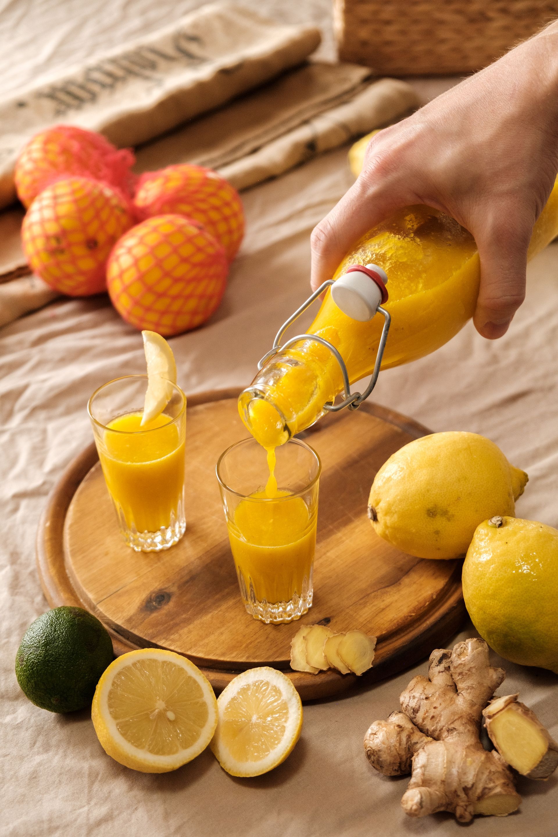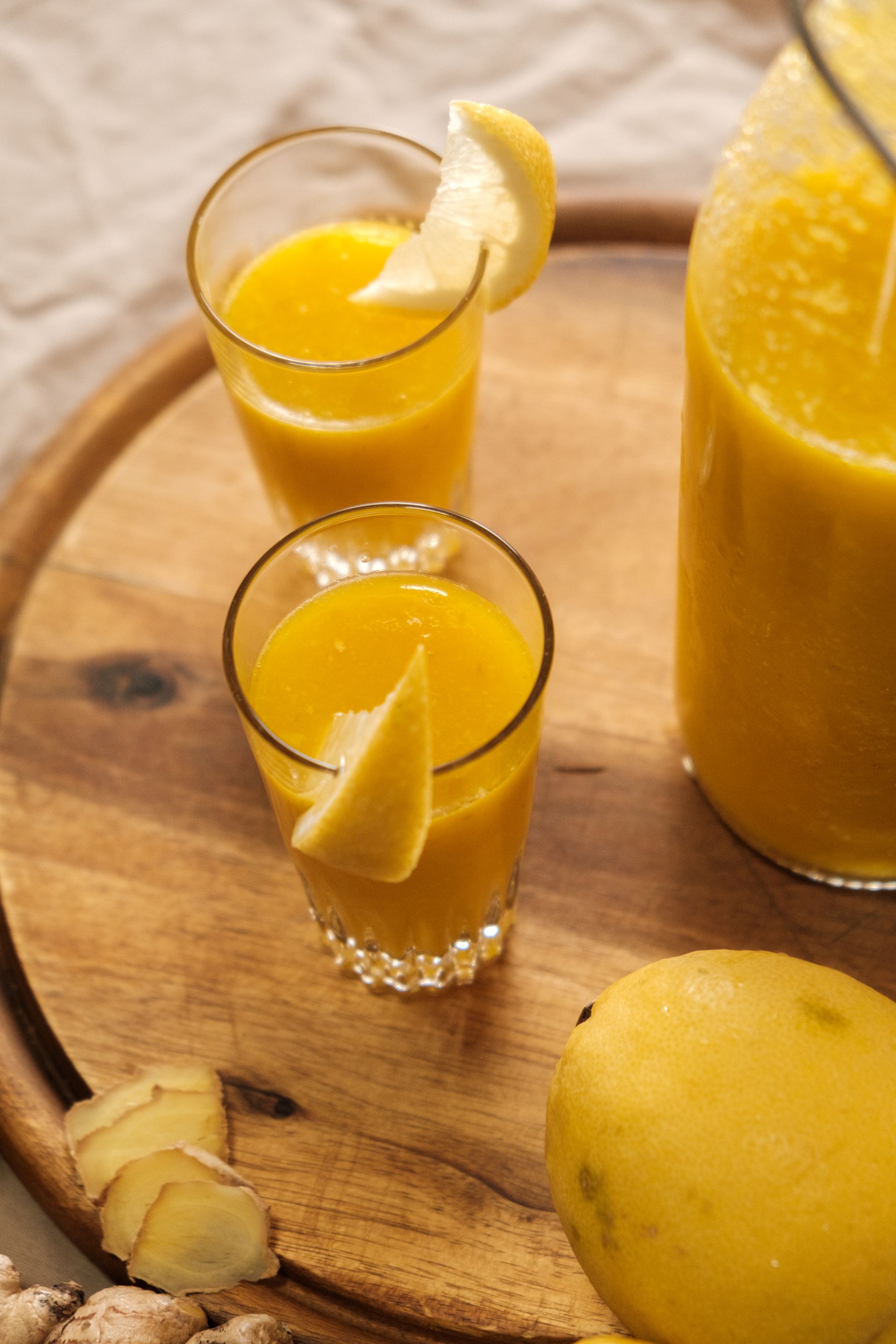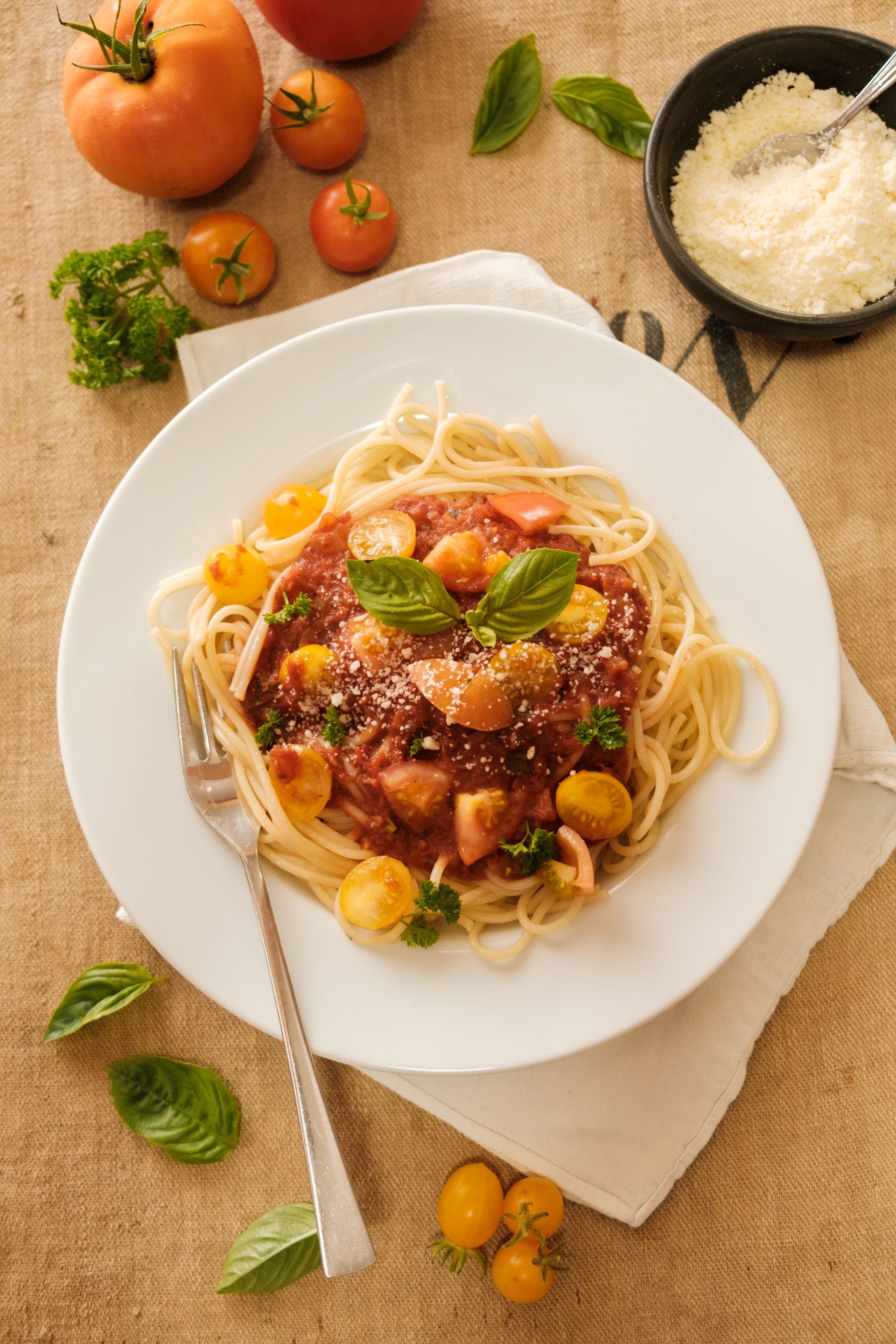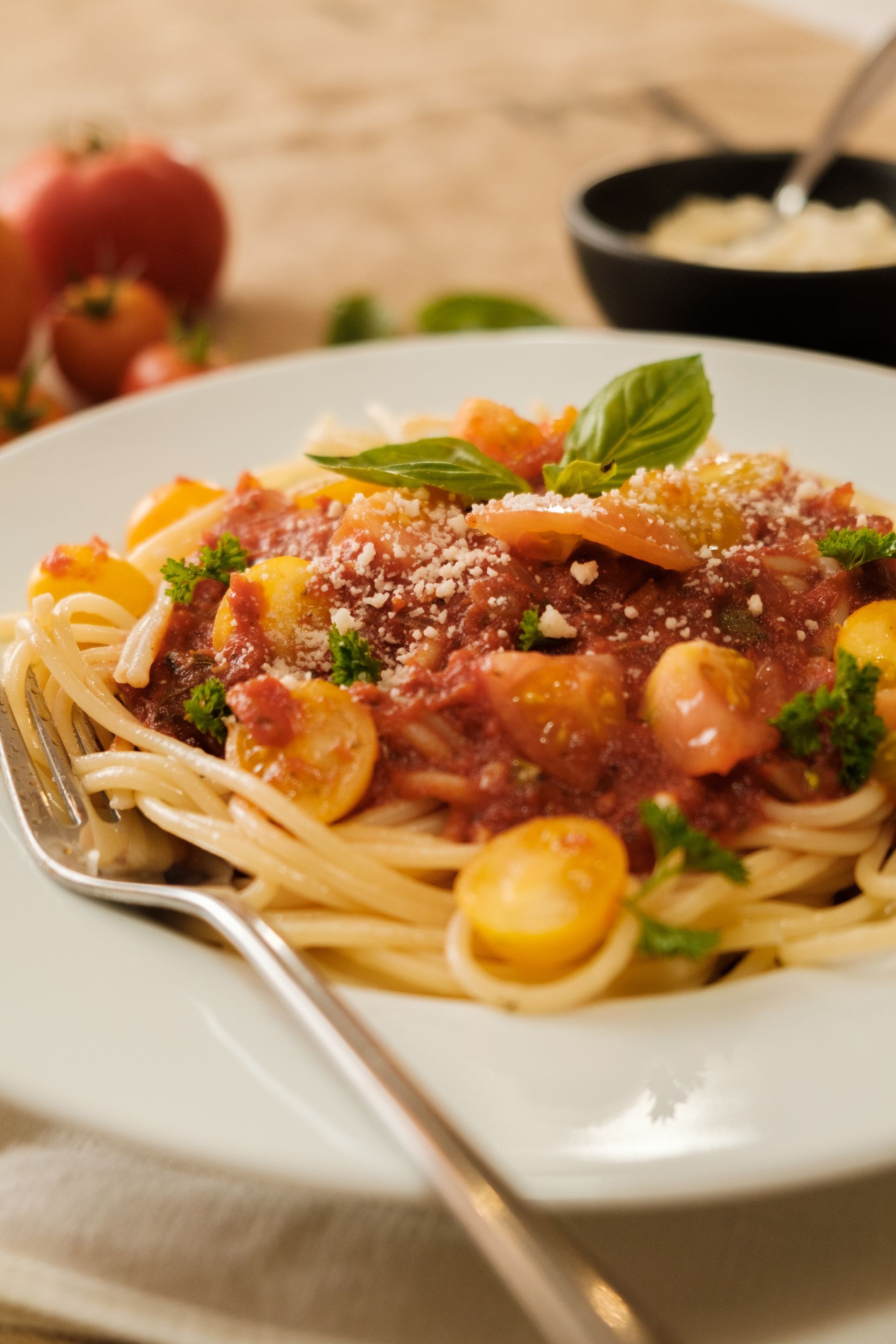 Ich habe ansprechende Bilder von frisch zubereiteten Spaghetti und stilvoll angerichteten Ingwershots erstellt.